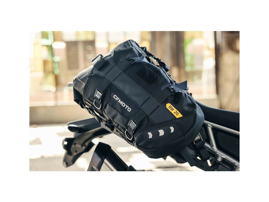 Dvě dvacetilitrové vodotěsné off‑road brašny pro motocykl 450MT z řady originálního příslušenství CFMOTO. Pro optimální a bezpečnou fixaci na motocyklu nedoporučujeme instalovat na trubkové držáky kufrů ale použít originální plotny textilních brašen.