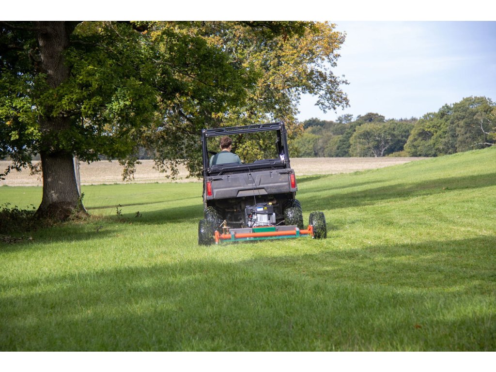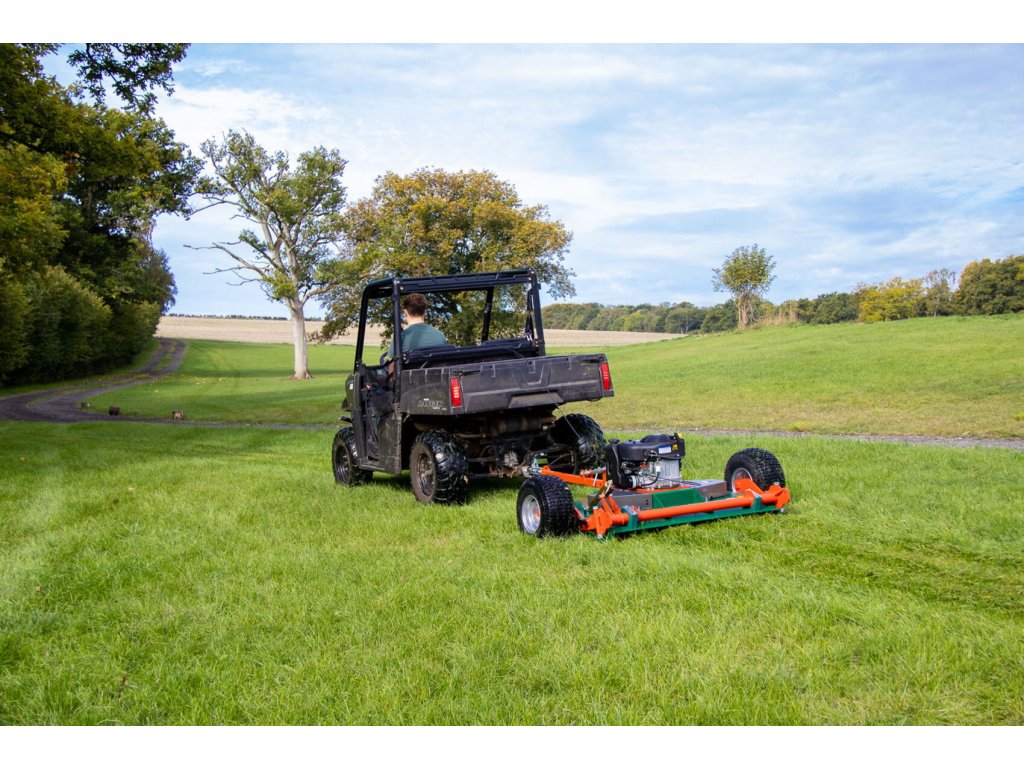Stroj je osazen spolehlivým 12,5hp motorem Briggs & Stratton s ručním startem. Tři rotory s překrývajícími se břity a robustní konstrukce zajišťují perfektní distribuci posečené trávy bez nežádoucích shluků. Díky centrifugální spojce můžeš zapínat a vypínat nože přímo ze sedadla čtyřkolky, což výrazně zvyšuje pohodlí a bezpečnost při práci.