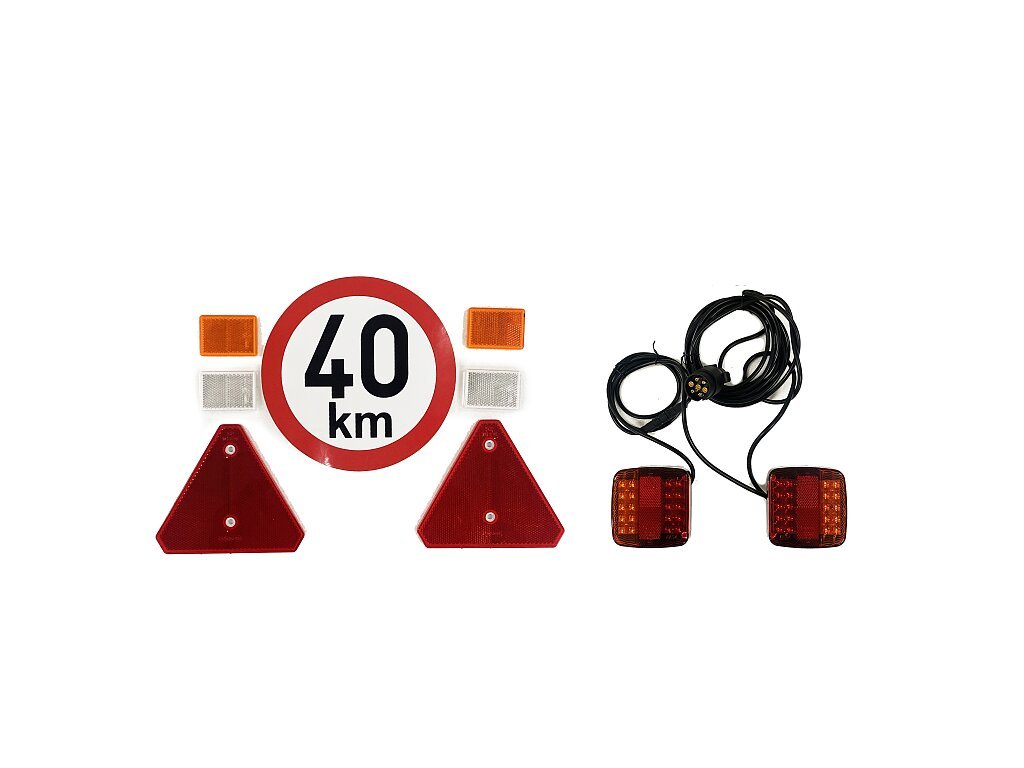 Homologační sada pro jednonápravový vozík QuadKit FARMER UNI 2W zahrnuje zadní LED osvětlení, předepsané odrazky, štítek s maximální konstrukční rychlostí a COC list pro přihlášení vozíku k provozu na veřejných komunikacích a tedy přidělení registrační značky.
