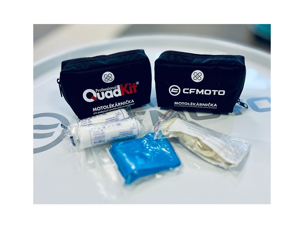 Kompaktní motolékárnička v omyvatelném obalu s logem CFMOTO na jedné straně a QuadKit Professional na druhé. Ideální pro motocykly, čtyřkolky, UTV i SSV.